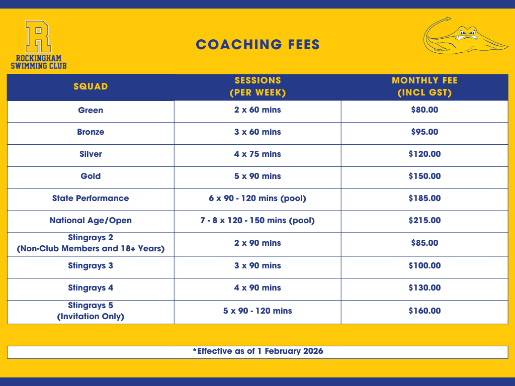 Coaching fees are not able to be adjusted if swimmers cannot attend the set number of sessions each week.
