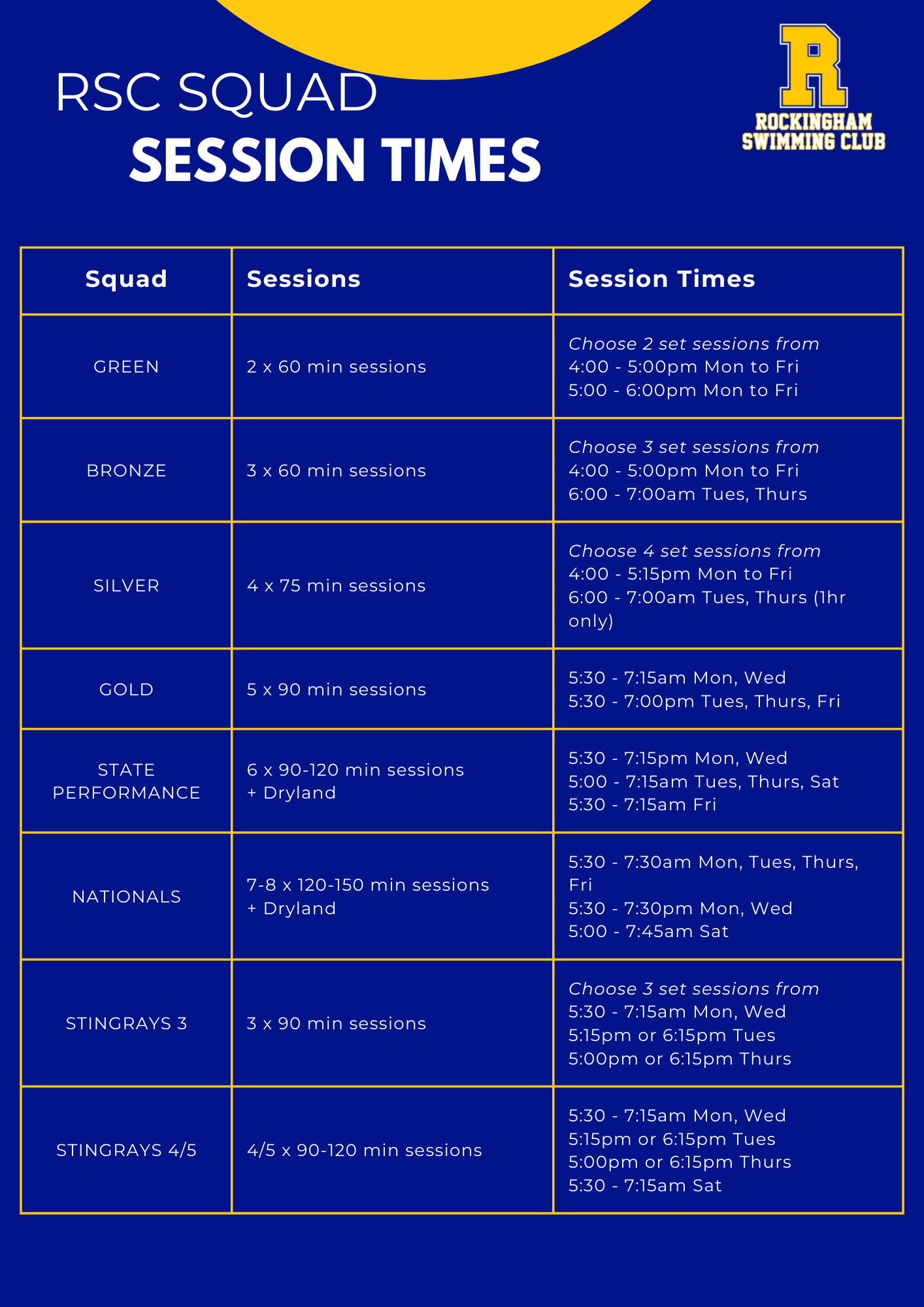 Please note: The ‘Select Your Sessions’ option is only applicable to the following squads - Green, Bronze, Silver and Stingrays. Swimmers transitioning to Gold, State Performance and Nationals squads use the 'Select Your Sessions' button to confirm your place in the new squad.